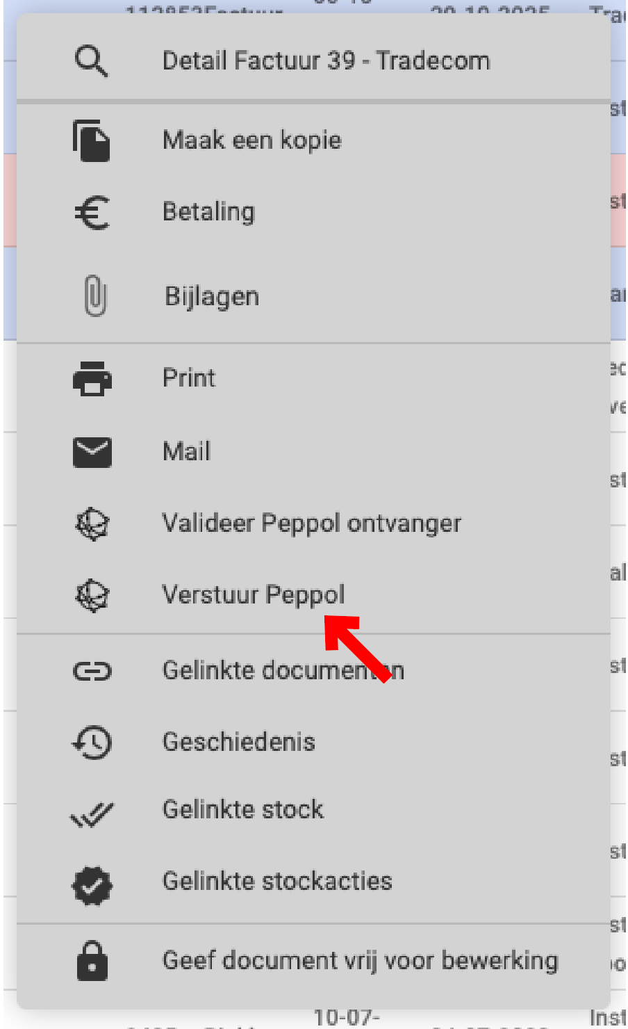 - Cliquez avec le bouton droit sur l’une des factures sélectionnées, puis choisissez l’option « Envoyer via Peppol » ou « Envoyer via Peppol (en lot) » si vous envoyez en masse.