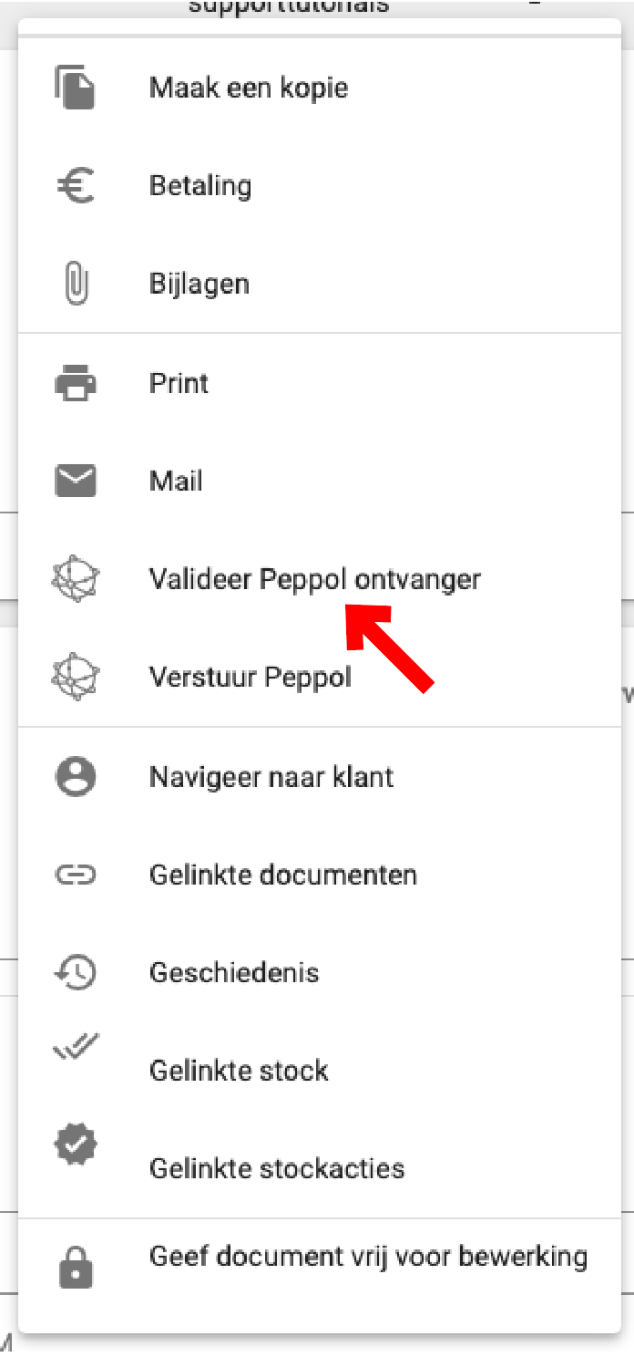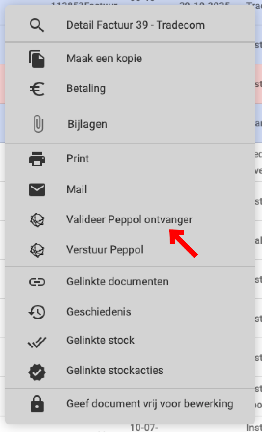 - Cliquez sur l’icône d’engrenage en haut à droite. Choisissez l’option « Valider le destinataire Peppol ».