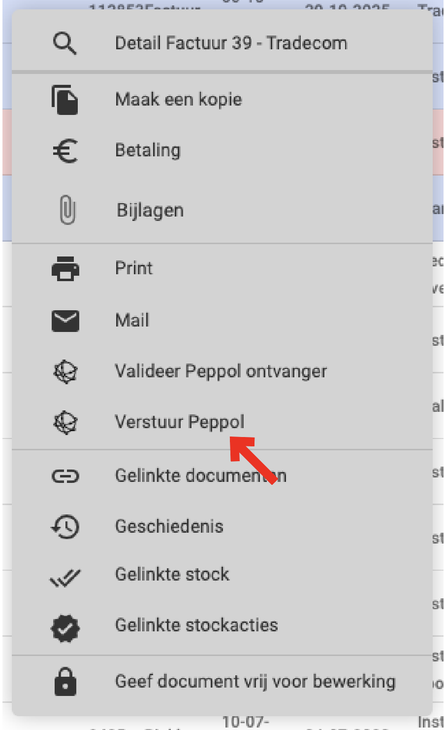 - Klik met de rechtermuisknop een factuur die je wilt verzenden. En kies voor de optie 'Verstuur Peppol' of 'Verstuur Peppol (bulk)' als je in bulk wilt verzenden.