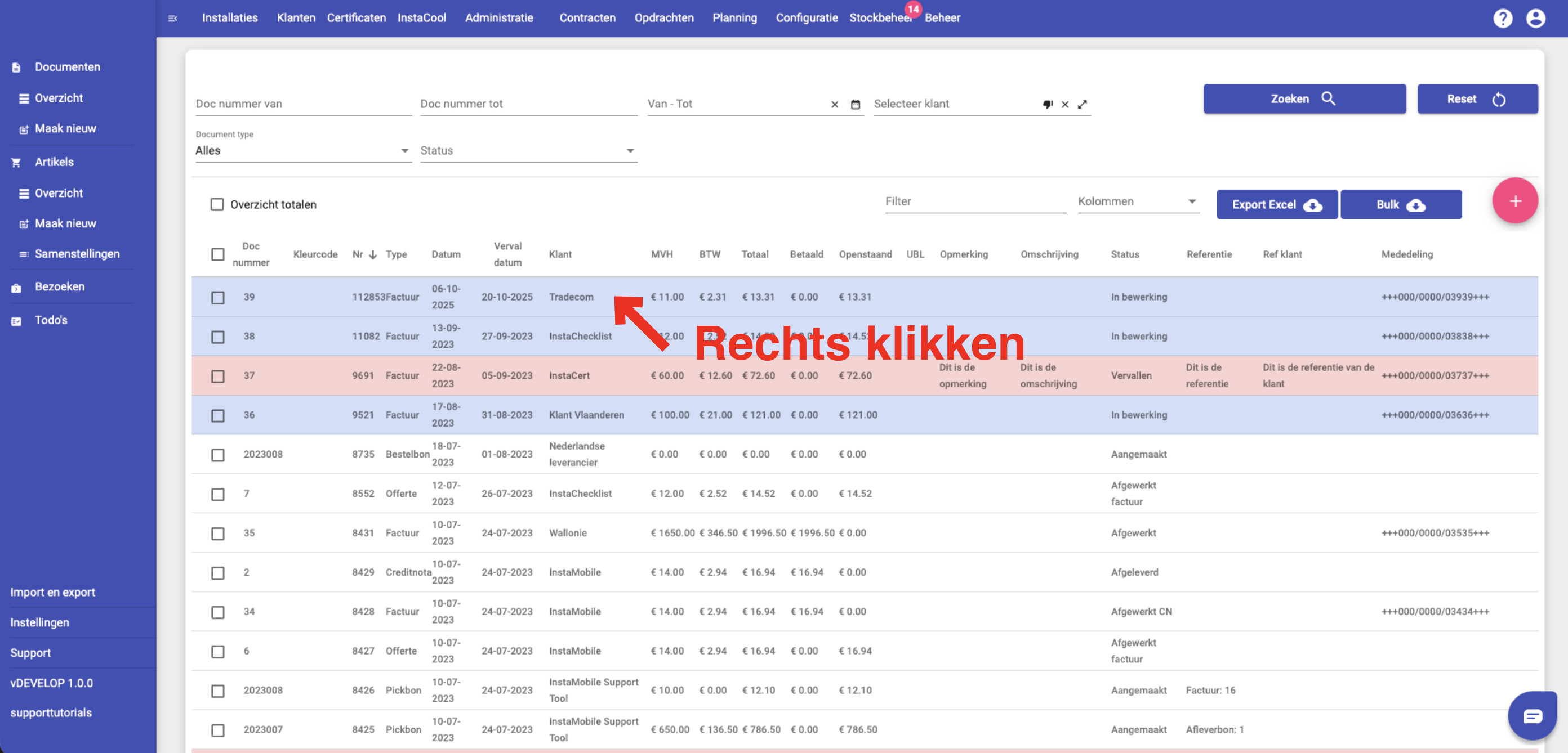 - Klik met de rechtermuisknop op een factuur waarvan je de ontvanger wilt controleren. En kies voor de optie 'Valideer Peppol ontvanger'.