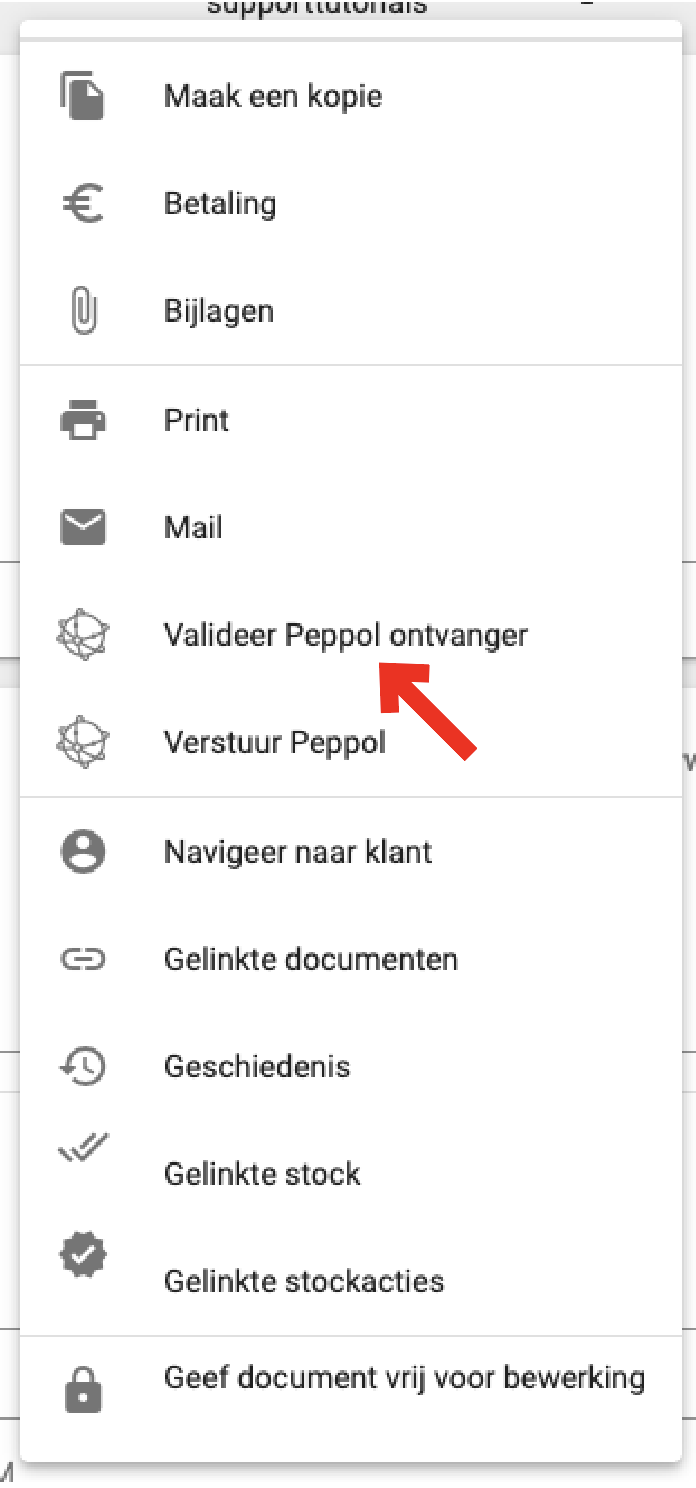 - Klik op het tandwieltje rechtsboven. En kies voor de optie 'Valideer Peppol ontvanger'.