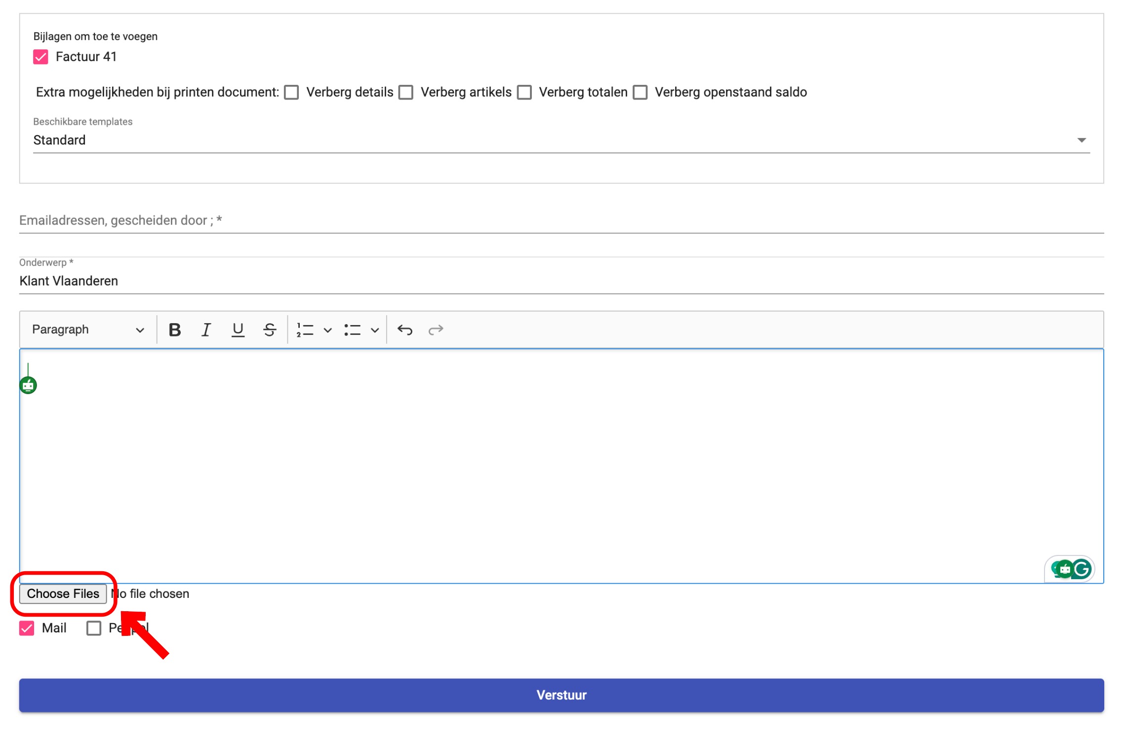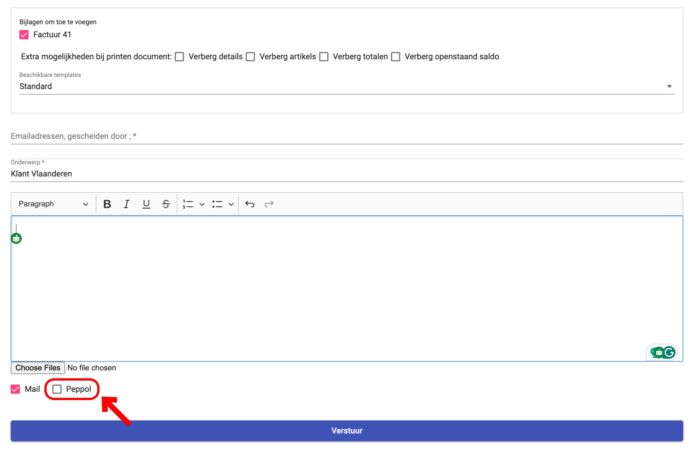 - Check de andere gegevens van de mail en klik op 'Verstuur'. Nu wordt de mail en Peppol verstuurd.